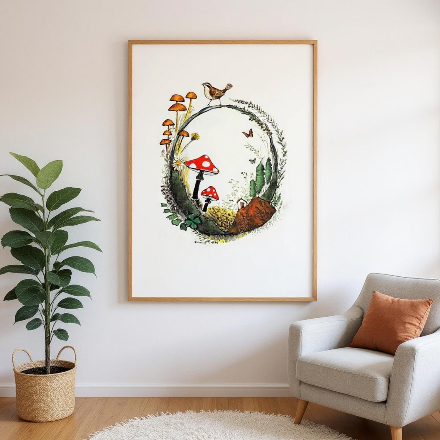 Ready-to-hang right out of the box, each piece includes a hanging kit for easy installation as UK wall art or a thoughtful British gift. This magical mushroom art captures the essence of British heritage and fairy illustration styles.
