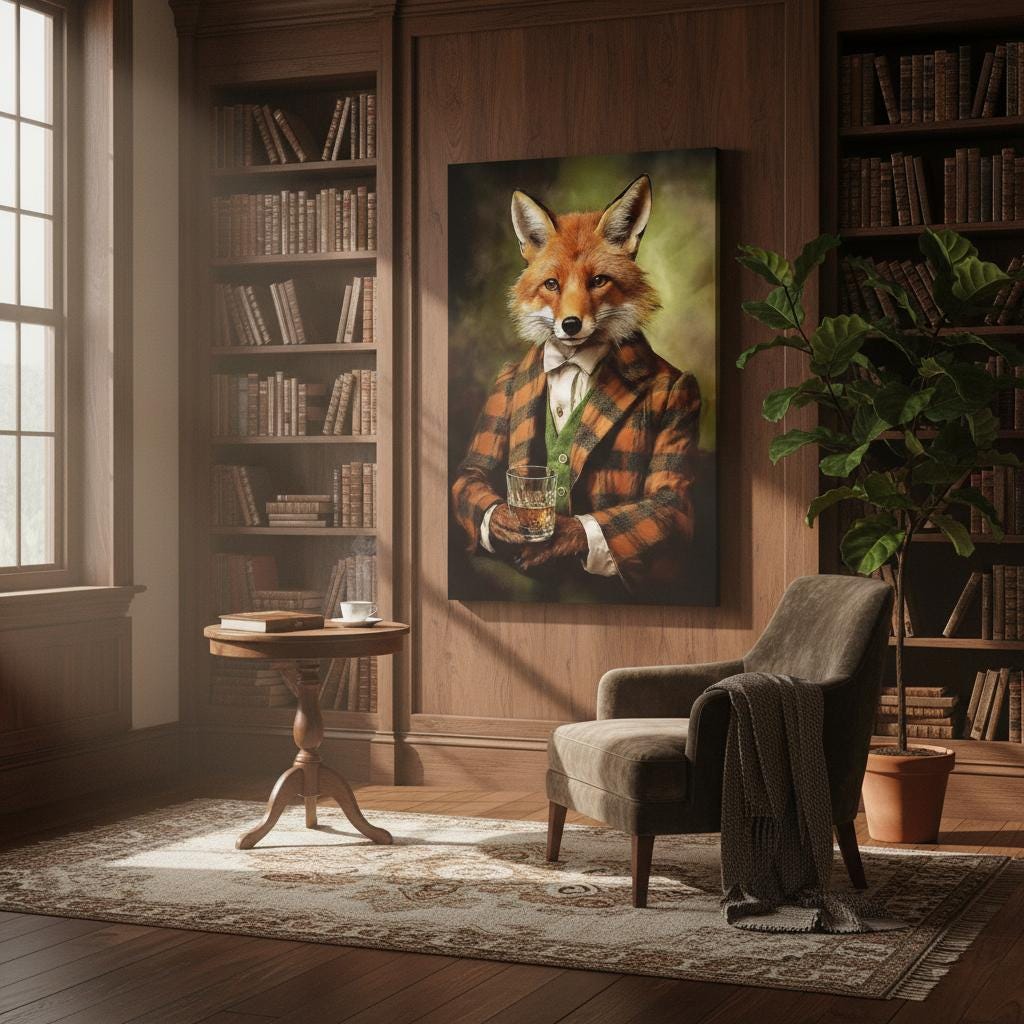 Transform your space with our stunning Victorian Red Fox Drinking Whiskey Canvas Print, a true homage to classic UK heritage art. This captivating piece captures the essence of English elegance and charm, reminiscent of vintage illustrations that tell a story. Perfect for bringing a touch of sophistication to any room, this canvas print is ideal for art lovers, fox enthusiasts, or anyone looking to add a unique statement piece to their home.